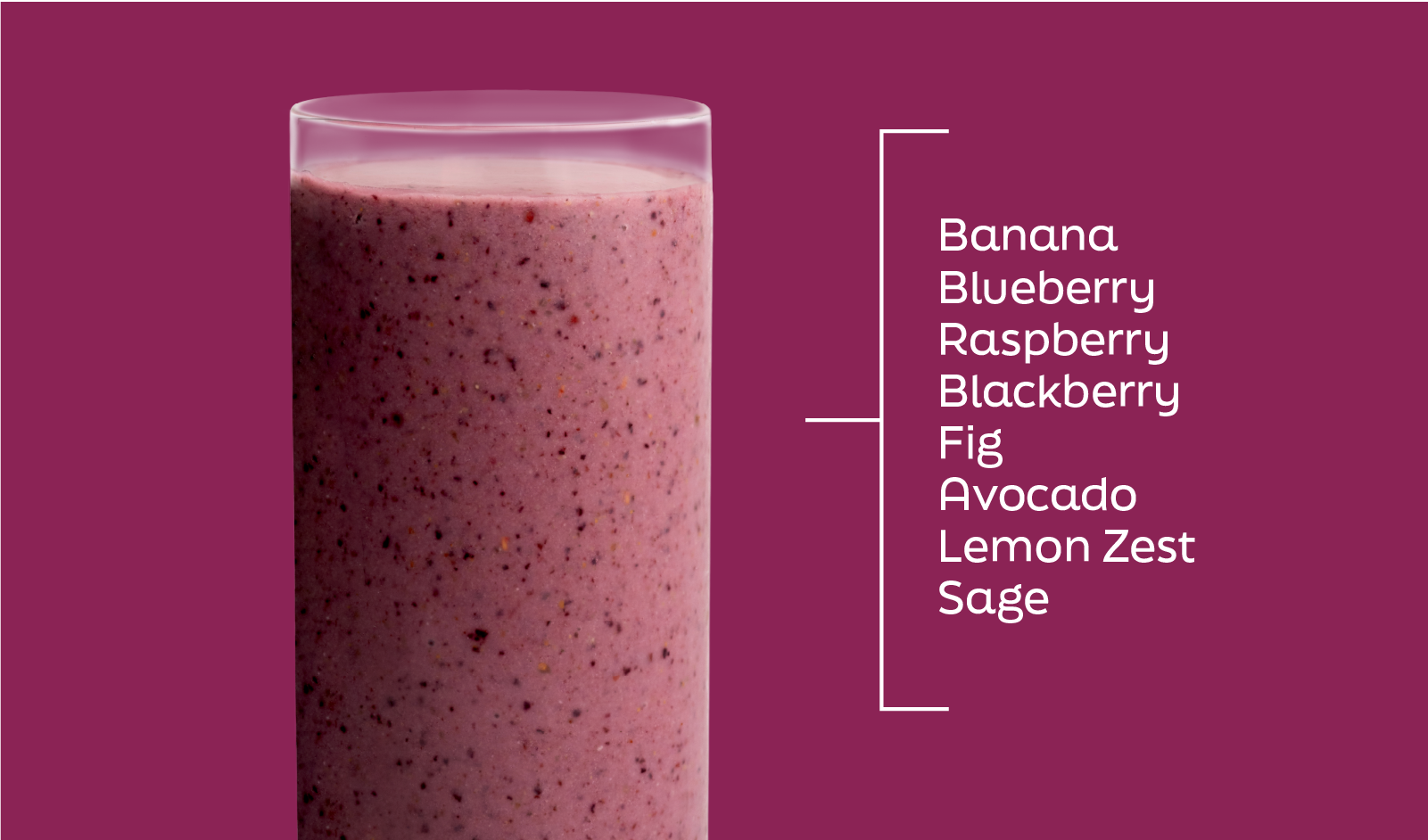 This isn’t your average berry smoothie. Juicy blueberries, blackberries, and raspberries bring the sweet-tart punch, while creamy avocado adds body and fig sneaks in a touch of jammy sweetness. Lemon zest keeps things bright, and a whisper of sage makes the whole blend feel earthy, unexpected, and totally addictive.